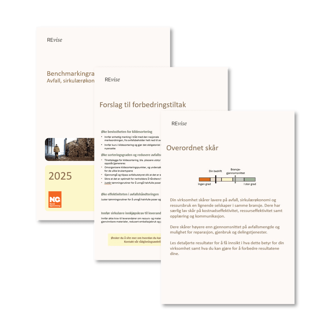 Rapporten fungerer også som et første steg i et videre rådgivningsløp, der vi kan bistå dere med å redusere avfall og forbedre sorteringsgrad, identifisere sirkulære muligheter og sikre etterlevelse av gjeldende regelverk.
